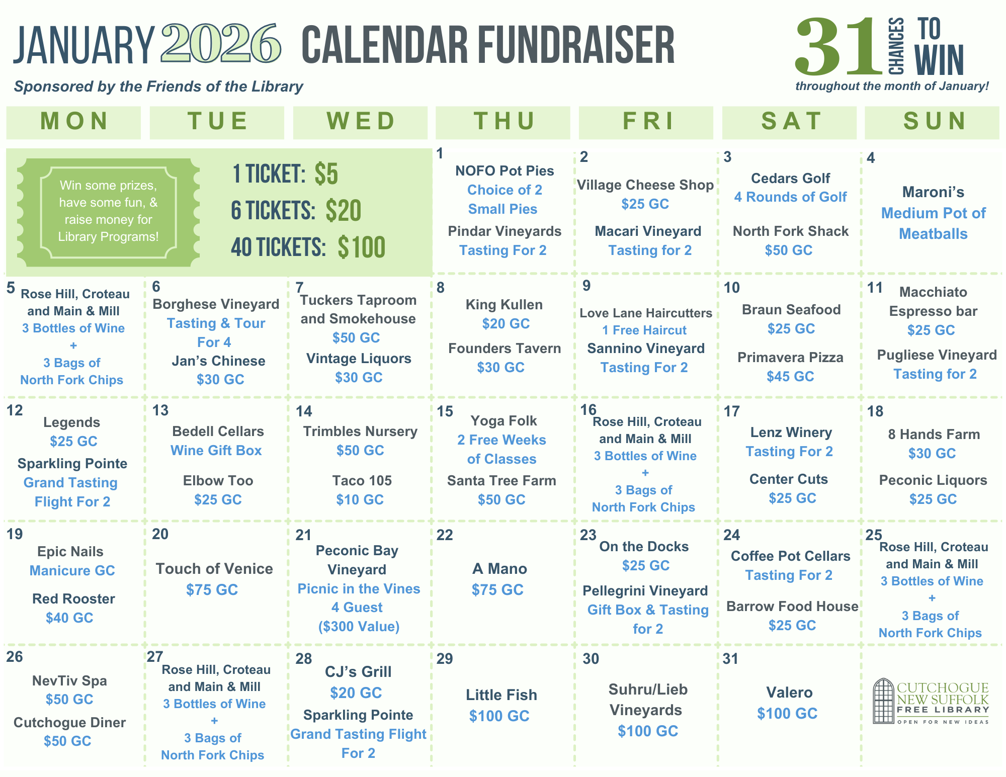From local restaurant gift cards to yoga classes and private wine tastings, you don't want to miss out on a chance to win these prizes! Enter the 2026 Library Calendar Fundraiser today. 💚![]()
